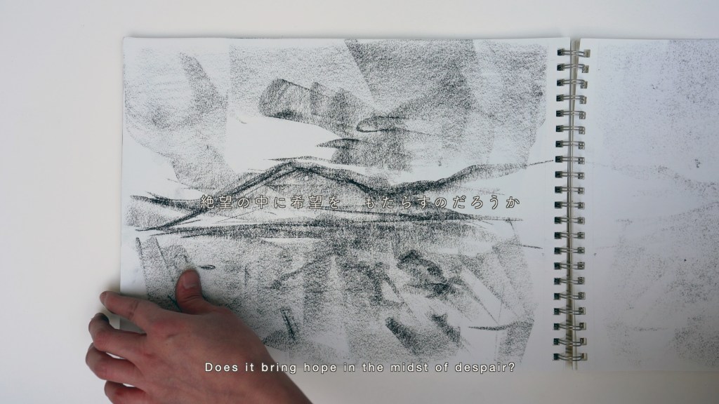 アメリカの日系人強制収容所では、日系人アーティストが指導する美術教室が存在し、多くの日系人が風景画などを描くことが許可されていました。この映像作品では、私の曾祖父が収容されていたトパーズ収容所の跡地で、私が描いた山のドローイングを基に「収容とアート」をテーマに、戦争やアートの検閲に言及した自身の詩を用いて制作しました。