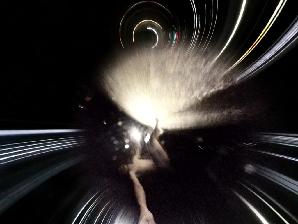 今年の7月中旬、東京の自宅から福井の美浜原発まで自転車で向かった。その道中を撮影していたが、振動を軽減するためのスタビライザーが壊れ、回転が止まらなくなった。その後美浜原発に到着し、夜に目の前の海で、カメラを持ちながら踊った。今回撮影に使った360度カメラは、両サイドに2個の魚眼レンズがついている。撮影した2つの映像の間を、ソフトウェアでスティッチング(縫い付け)すると、VRで見るような全天球のができあがる。スティッチングする2つのデータは違う映像でもよいのではと思い、「回転する道中の映像」と「美浜原発で踊る映像」をスティッチング、3:4の画角で編集し作品化した。