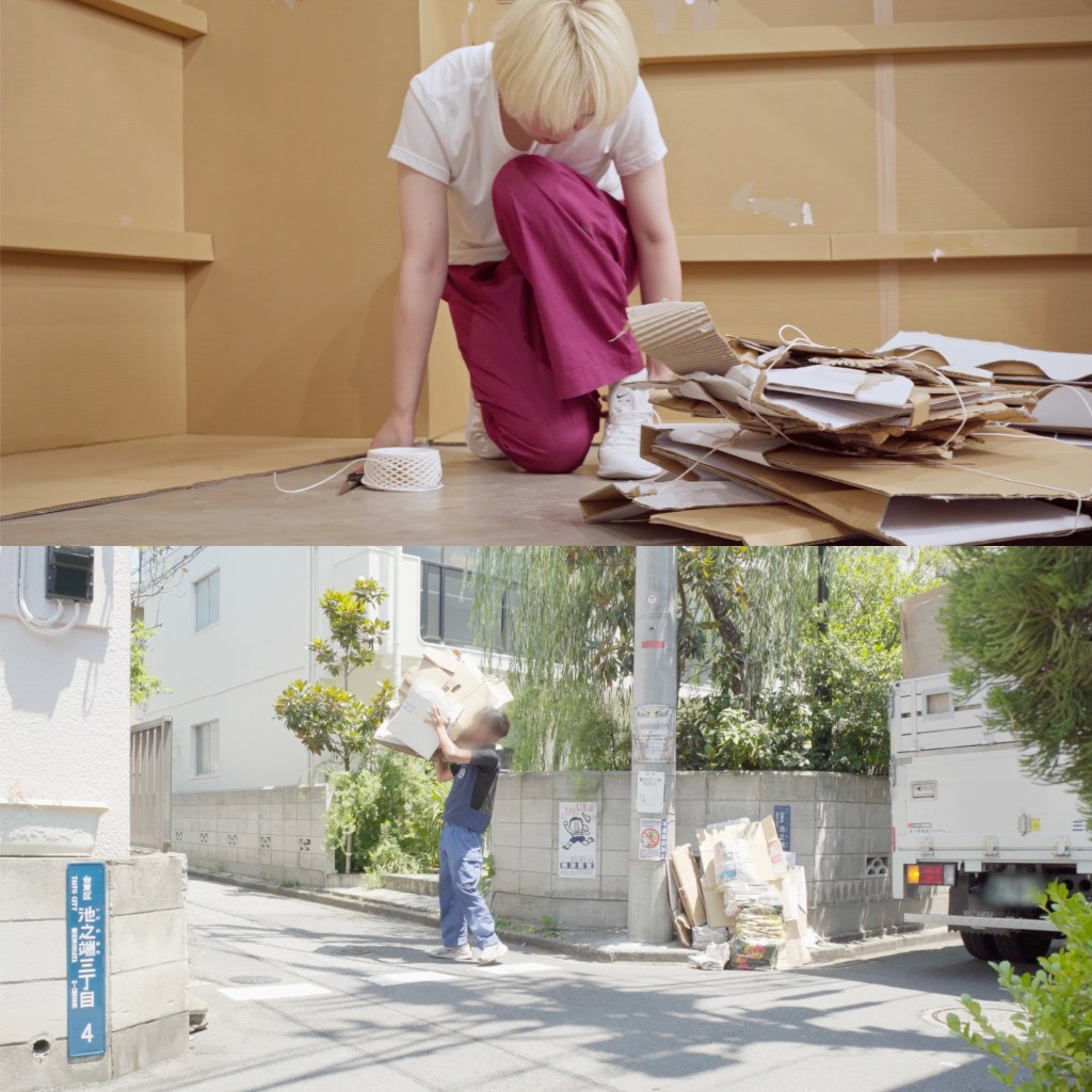 本作品は、「理想の家」を象徴するドールハウスのようなインスタレーションが、1ヶ月の展示期間中に3回のパフォーマンスによって段階的に解体され、ゴミ収集日に段ボールの資源ごみとして回収されるプロセスを記録した映像である。虚構として価値を与えられた一つ一つの造形物としての「箱」が再び素材としての「箱」へと還元され、現実の時間軸に戻り、制度に触れ、そして他者の手に渡る――その瞬間とは何を意味するのだろうか。